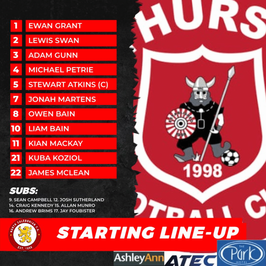 Subs – Liam Bain off Sean Campbell on, Kuba Koziol and Kian Mackay off Andrew Brims and Josh Sutherland on, James McLean off Craig Kennedy on, Lewis Swan off Allan Munro on.
